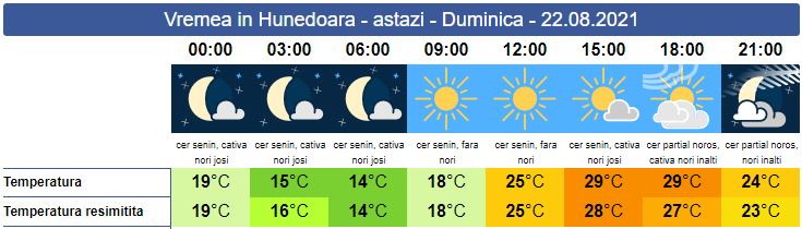 Duminică, soarele ne va surâde și va răsări la ora 06:35. În general, cerul va fi senin, iar temperaturile vor fi în creștere. Vântul va sufla slab spre moderat, doar spre seară cerul va deveni parțial noros. Soarele va apune la ora 20:27. Minimele zilei se vor înregistra între 19 și 14 grade, iar maximele, în jurul valorii de 29 de grade.