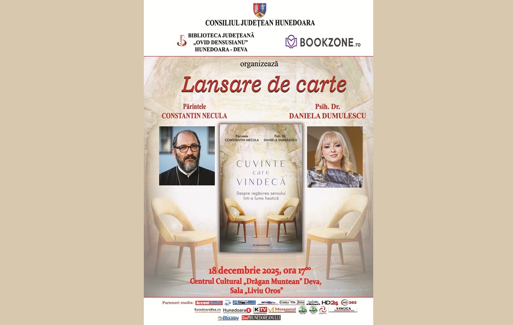 Biblioteca Județeană „Ovid Densusianu” Hunedoara – Deva, cu sprijinul Consiliului Județean Hunedoara și în parteneriat cu Editura Bookzone din București, organizează în ziua de 18 decembrie 2025, ora 1700, în Sala „Liviu Oros” a Centrului Cultural „Drăgan Muntean” din Deva, un eveniment cultural-spiritual cu totul special: lansarea volumului „Cuvinte care vindecă. Despre regăsirea sensului într-o lume haotică”, apărut la Editura Bookzone în anul 2025, ai cărui autori sunt părintele Constantin Necula și doamna psiholog dr. Daniela Dumulescu.