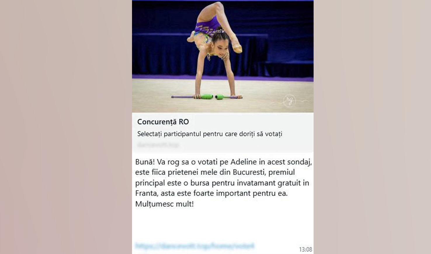 Mesajul arăta astfel: „Bună! Te rog să o votezi pe Adeline în acest sondaj. Este fiica prietenei mele, iar premiul este o bursă pentru studii în Franța. Mulțumesc mult!” urmat de un link malițios.