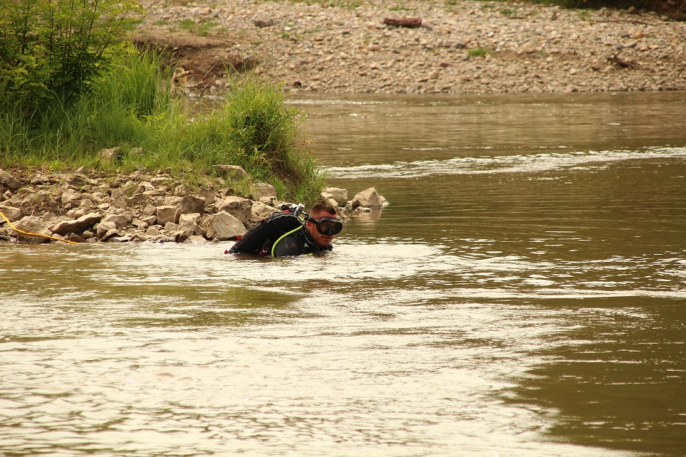Scafandri de la ISU Hunedoara care cercetează fundul râului în zona în care au fost găsite lucrurile tatălui şi ale fiului său sunt precauţi şi asiguraţi. De-a latul apei este întinsă o coardă de care este prins cel care se scufundă. „Apa nu e rece deloc, e călduţă, pot să înţeleg de ce copilul a intrat la scaldă, dar e greu să faci faţă curenţilor care sunt foarte puternici. Apa nu prea are vizibilitate, e chiar mâlos în multe porţiuni”, spune plutonier major Dorel Ioja. Pe malul celălalt, alte echipaje de pompieri şi paramedici aşteaptă un semn de la colegii lor. Un alt echipaj cercetează din barcă malurile Mureşului.