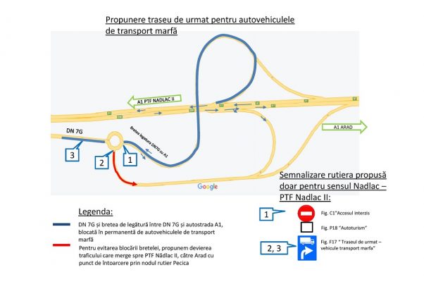 Direcţia Regională de Drumuri şi Poduri Timişoara informează participanţii la trafic că, începând de astăzi, 15 martie, pentru a elimina disconfortul creat de blocajul format de transportatorii de marfă pe DN 7G și breteaua de acces pe autostrada A1, autovehiculele de transport marfă nu vor mai putea folosi breteaua de acces spre A1 de la km 582+666 al autostrăzii, pe sensul Nădlac – P.C.T.F. Nădlac 2, fiind direcționate din sensul giratoriu de pe DN 7G km 6+667, pe autostrada A1 către Arad. Autovehiculele de transport marfă trebuie să se întoarcă spre P.C.T.F. Nădlac 2 prin nodul rutier Pecica de pe A1 km 558+618, intrând în traficul normal de pe autostradă.