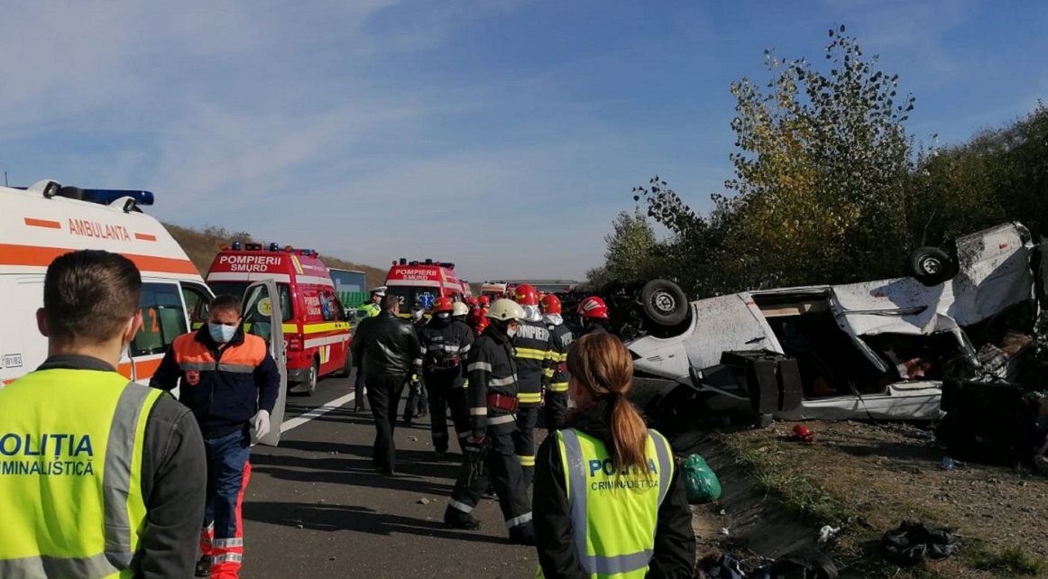 Un accident rutier grav în care au fost implicate un microbuz cu 15 persoane la bord și o autoutilitară s-a petrecut în această amiază, în jurul orei 11:50, pe autostrada A1.