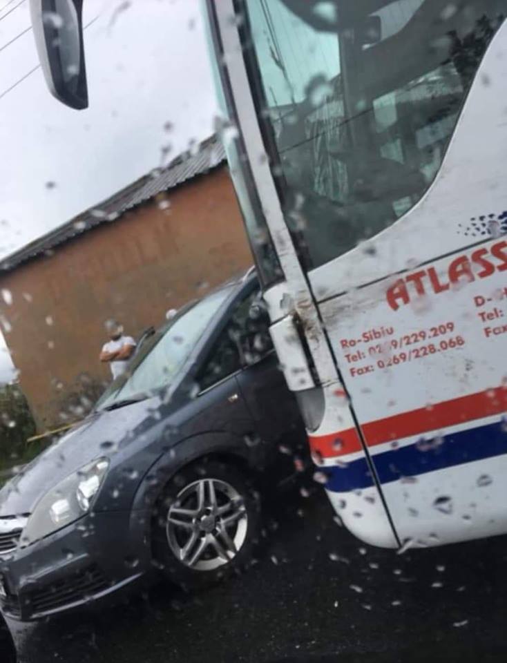 UPDATE: „În data de 24.09.2018, în jurul orei 13:00, un bărbat în vârstă de 53 de ani, din municipiul Sibiu, în timp ce conducea un autobuz pe Calea Zarandului, din municipiul Deva, din direcția Arad spre Sibiu, nu a păstrat o distanță de siguranță în mers față de autoturismul condus de un bărbat de 44 de ani, din judeţul Arad, pe care l-a tamponat în partea din spate, după care a ricoșat în semiremorca tractată de autoutilitara condusă de un bărbat de 45 ani, din judeţul Bihor. În urma evenimentului rutier, a rezultat rănirea ușoară a unei femei de 36 de ani, psageră în autoturism. În cauză s-a întocmit dosar penal pentru săvârșirea infracțiunii de vătămare corporală din culpă”, precizează comunicatul IPJ Hunedoara.