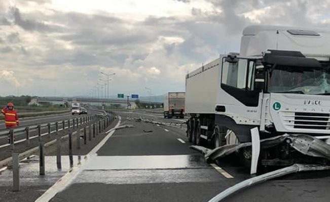 Astăzi, pe autostrada A1, la km 354, în jurul orei 11:00, un autocamion a pierdut controlul asupra direcției, a lovit parapetul median și a intrat pe sensul opus.