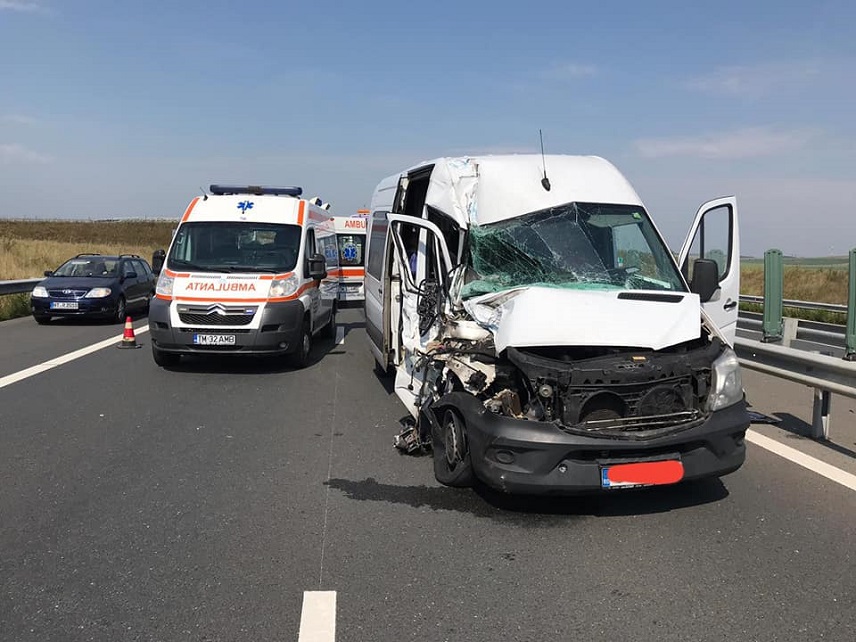 Centrul INFOTRAFIC din Inspectoratul General al Poliţiei Române informează că pe sensul către Lugoj al autostrăzii A1 Timişoara – Lugoj, la kilometrul 472, în zona localităţii Şanoviţa (judeţul Timiş), a avut loc un accident rutier în care au fost implicate un microbuz (care tracta pe platformă un alt vehicul) şi un tir. Două persoane au fost rănite. Circulaţia auto se desfăşoară îngreunat, pe banda de urgenţă.
