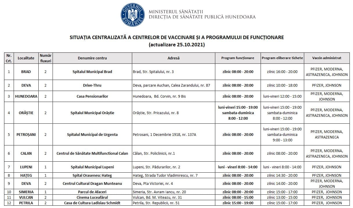 Programul centrelor de vaccinare din localitățile Deva, Hunedoara, Brad, Orăștie, Călan, Hațeg, Lupeni, Vulcan, Simeria și Petrila este prezentat în fotografia acestei informări.