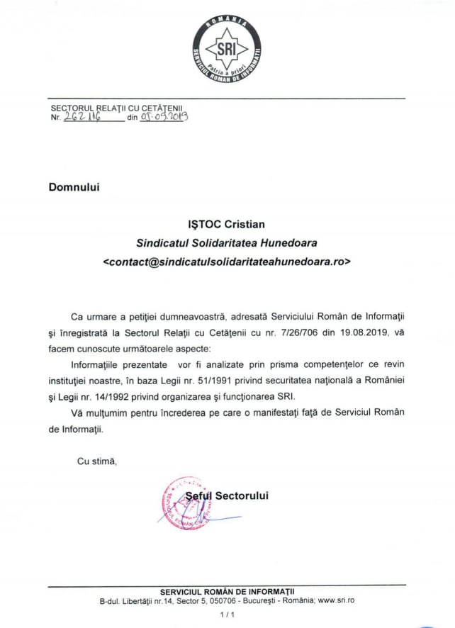 Cei de la Serviciul Român de Informații vor analiza informațiile prezentate de sindicaliști.