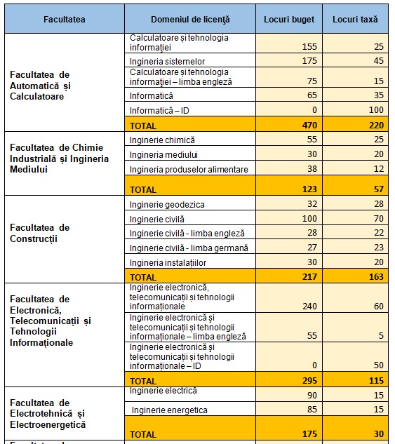 Concursul de admitere, atât în cazul celui cu probe scrise (de matematică, tip grilă, la Facultatea de Automatică și Calculatoare și la Facultatea de Electronică, Telecomunicații și Tehnologii Informaționale, respectiv desen tehnic și liber la Facultatea de Arhitectură și Urbanism), cât și în cazul celui de dosare, va avea loc în 22 iulie, rezultatele urmând să fie afișate în 23 iulie 2019. Urmează trei runde de confirmări succesive, iar rezultatele finale se vor afișa în 26 iulie 2019.