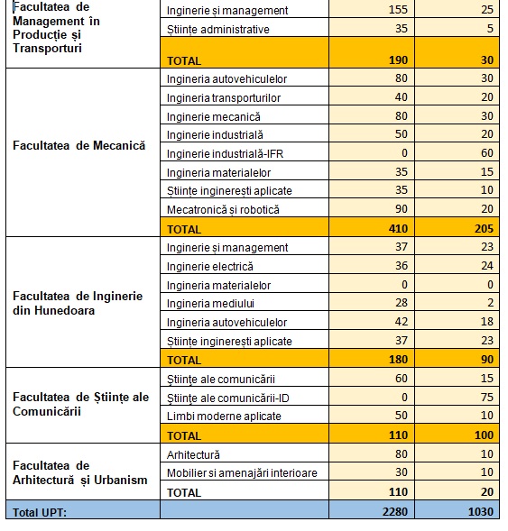 Ca urmare a aprobării cifrelor de școlarizare pentru învățământul superior de către Ministerul Educației Naționale, Universitatea Politehnica Timișoara a repartizat numărul de locuri pe facultăți și domenii de licență. Așadar, admiterea la UPT în anul academic 2019 – 2020, la ciclul de licență, se va realiza pe 2280 de locuri bugetate și 1030 de locuri cu taxă, conform tabelului de mai jos. Din acestea, 249 de locuri sunt alocate domeniilor prioritare, 100 de locuri sunt destinate elevilor proveniți de la licee din mediul rural, iar 4 locuri sunt pentru candidații de etnie romă.