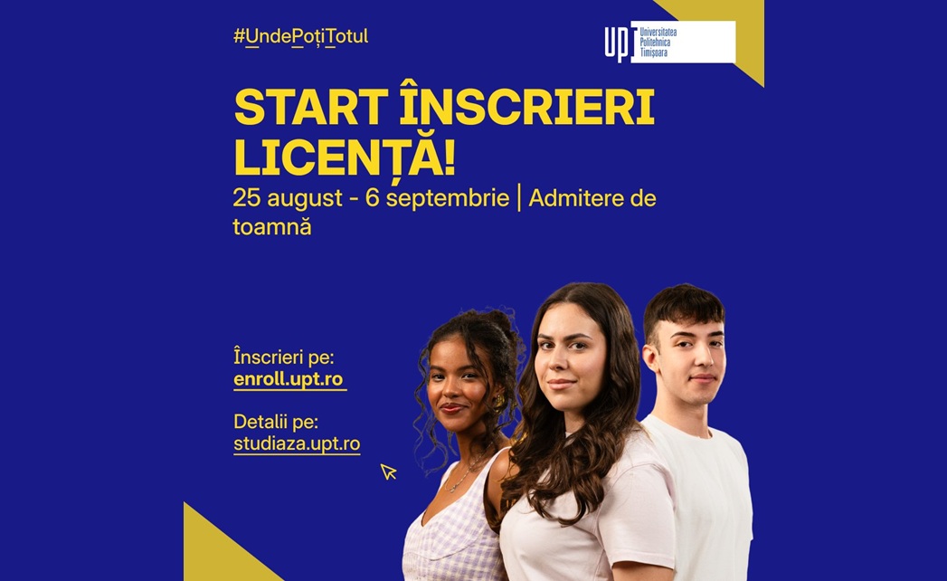 Detalii complete despre sesiunea de admitere de toaman 2025 se regăsesc pe site-ul dedicat: www.studiaza.upt.ro iar depunerea dosarelor are loc pe platforma https://enroll.upt.ro/.