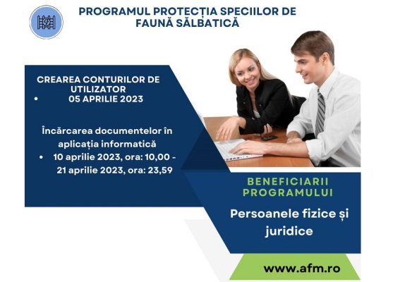 Administraţia Fondului pentru Mediu anunţă deschiderea sesiunii de finanţare a Programului privind protecţia speciilor de faună sălbatică, începând de miercuri putându-se crea conturile de utilizator. Din 10 aprilie se vor putea depune cererile de finanţare, bugetul fiind de 70 de milioane de lei.