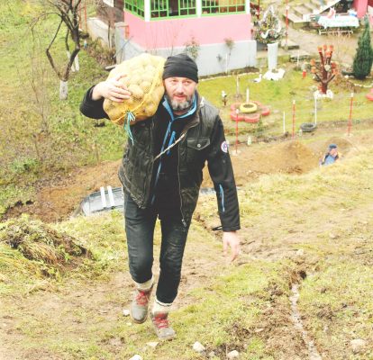 De la prima casă, printre crengile bradului împodobit cu bomboane, se văd deja voluntarii cum urcă dealul către Tanti Ana. Are 65 de ani şi vine greu, sprijinită în bâtă, privind la tinerii care duc către casa ei sacii cu provizii pentru iarnă şi mult râvnita plapumă nouă. E înfofolită peste gură cu un fular strâns, să nu intre aerul rece şi umed al zilei. Drumul spre casa ei e un urcuş anevoios şi alunecos, pe o pantă care taie în diagonală creasta. De la ea, voluntarii pleacă către căsuţa unei bătrâne.