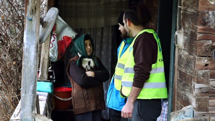 Toată lumea răsuflă uşurată şi … încântată. Peisajul e uimitor şi fotografii trag cadre după cadre. “Am făcut până aici vreo 100 de km, mai mergem un pic până în vale unde avem trei cazuri la care împărţim ajutoare”, explică Marius Achim voluntarilor care îl însoţesc şi care, în câteva minute, poposesc pe o uliţă abruptă.