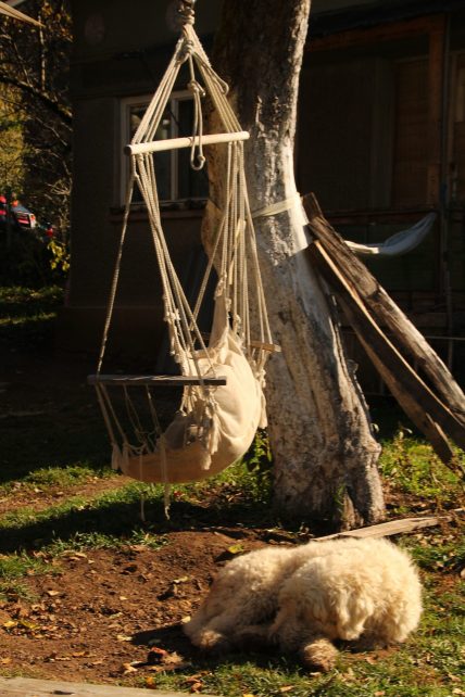 Mă aştept să găsesc o vilă care să zdrobească peisajul arcuit de munte, dar, acolo unde asfaltul se opreşte, în faţa porţii simple, de lemn, mi se deschid surprize. Un ciobănesc mare şi alb e primul semn de prietenie, doi copii zburdă fericiţi sub ochii senini ai părinţilor. Curtea e tot un covor de iarbă, florile se sprijină în gard de nuiele şi şuri tradiţionale de lemn îmi pun sufletul între maluri. Locul e simplu şi aşezat.