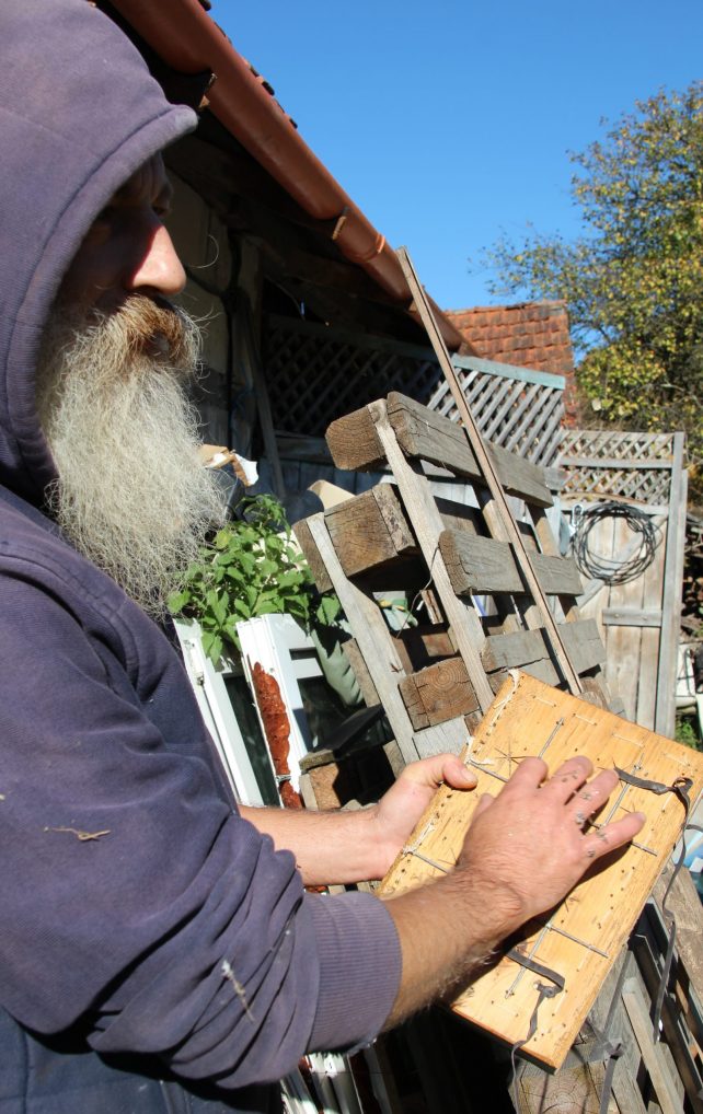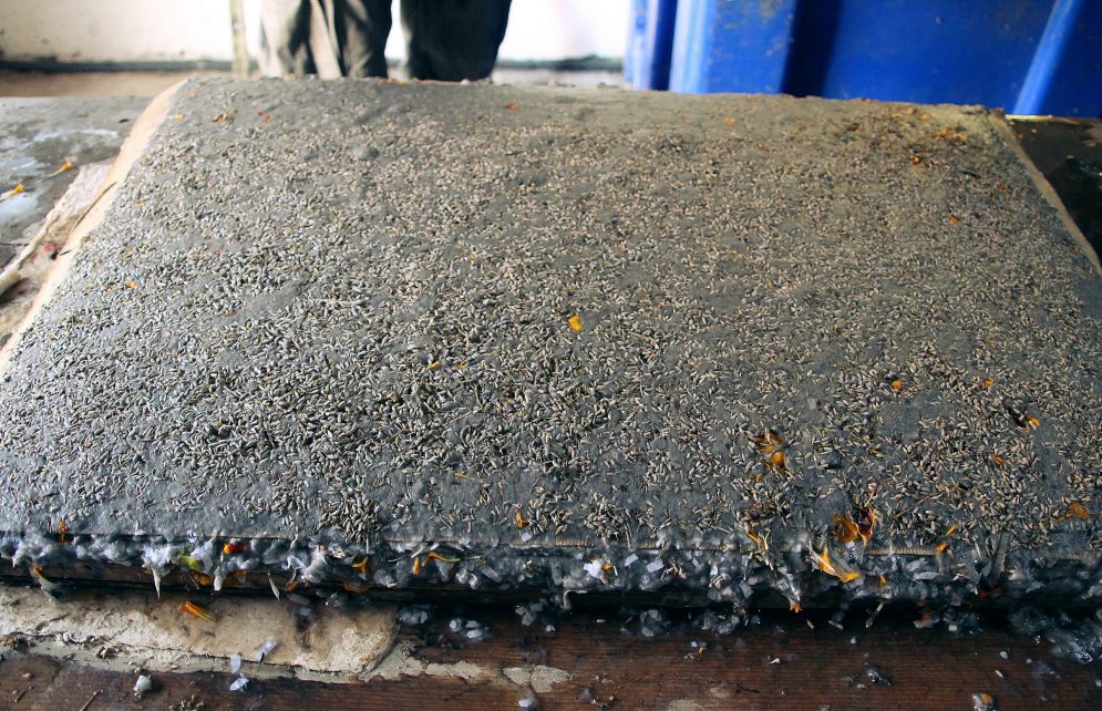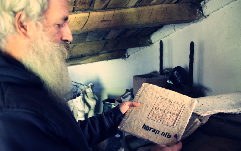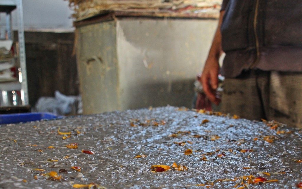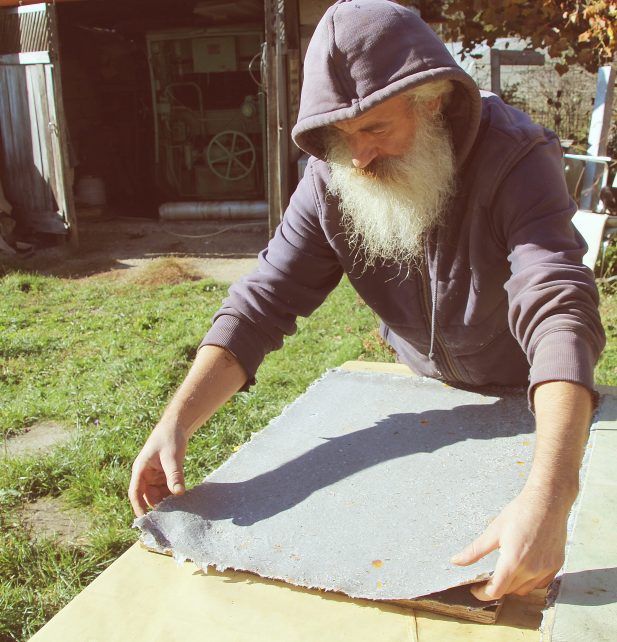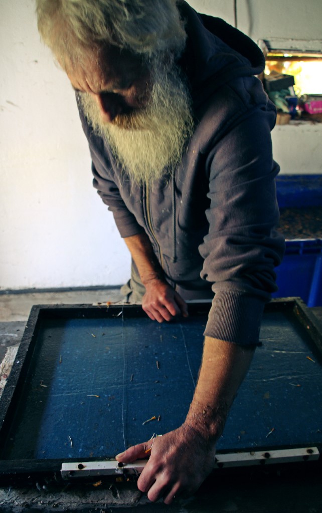 „Oricine poate face asta acasă – nu aruncăm deşeurile de hârtie, ci le punem la înmuiat, după ce se toacă cu un blender de casă şi, cu o sită, deasupra unui lighean se poate lucra liniştit”, povesteşte el, în timp ce apasă molcom şi repetat sita deasupra hârtiei.