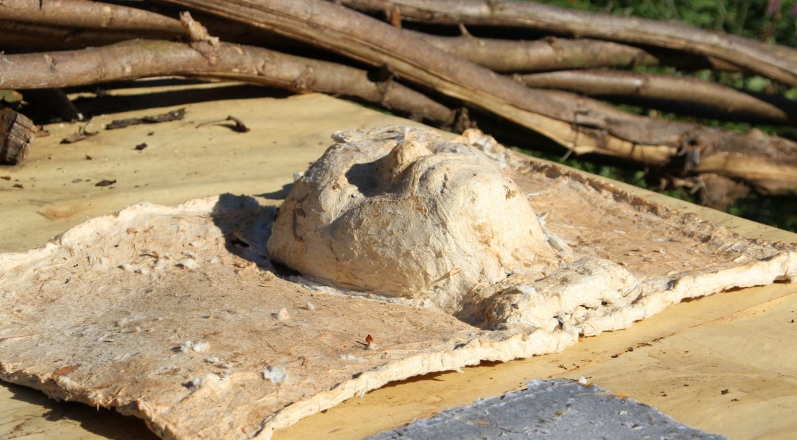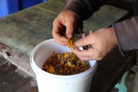 Păstrează în câteva boluri rodul verii: „Sunt petale, seminţe şi resturi vegetale din flora spontană de pe Valea Ribicioarei. Asta este hârtia la care vă arăt reţeta!” Bărbatul începe să desfacă cuibarele de flori strânse din vreme: „De aici încep: de la culegător de fibre, dar şi de seminţe.”