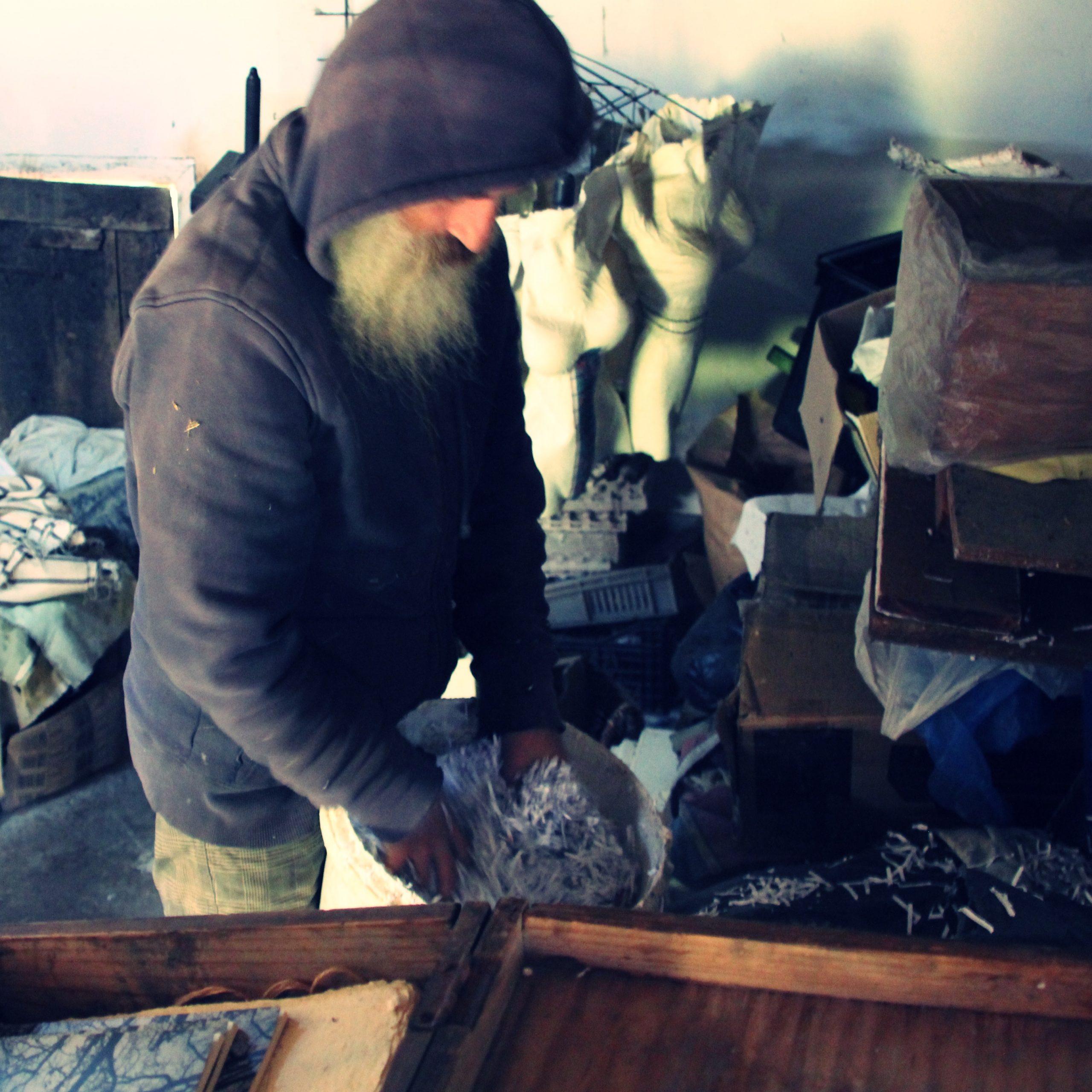 Ia deşeurile de hârtie mărunţite şi le introduce într-o căldare peste care adaugă apă. „Tot ce trebuie făcut ca să recâştigăm fibrele de celuloză din deşeuri este să le sortăm, să le alegem, să le mărunţim şi să le defibrăm, adică trebuie să le bată un cuţit neascuţit sau o bandă metalică astfel încât fibrele de celuloză care compun hârtiile şi plantele să se despartă unele de altele. Ca să fac asta, am construit un fel de tocător cu motor. Acesta învârte pasta şi o amestecă bine.”