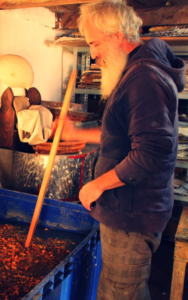 Ce face aici meşterul nu este doar o hârtie frumoasă şi bine mirositoare, ci o hârtie blândă, pe care o simţi făcută alene, în ritmul vieţii de munte. De ani de zile de când lucrează, a reuşit să descopere peste o mie de reţete de hârtie realizate manual, o parte dintre ele – „pe care le fac eficient” – sunt prinse într-un fel de mostrar al unor reteţe.