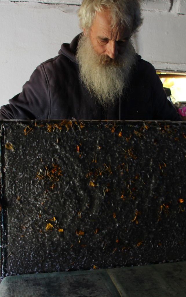 Poate e mai corect spus – hârtie plantabilă reciclată manuală. Folosesc doar deşeurile, apă curată peste care se pun seminţele şi plantele uscate.” Petalele în culori vii ale crăiţelor se amestecă bine în pastă. Meşterul lucrează inclusiv cu mâinile, deşi apa e rece, dar contactul îl ajută să simtă dacă totul este pregătit pentru viitorul pas.