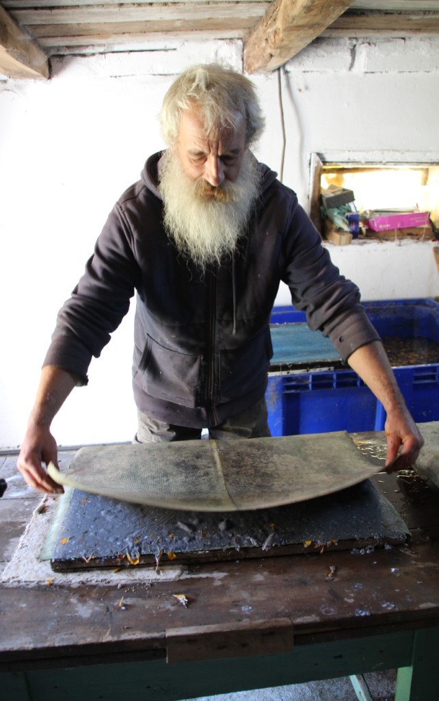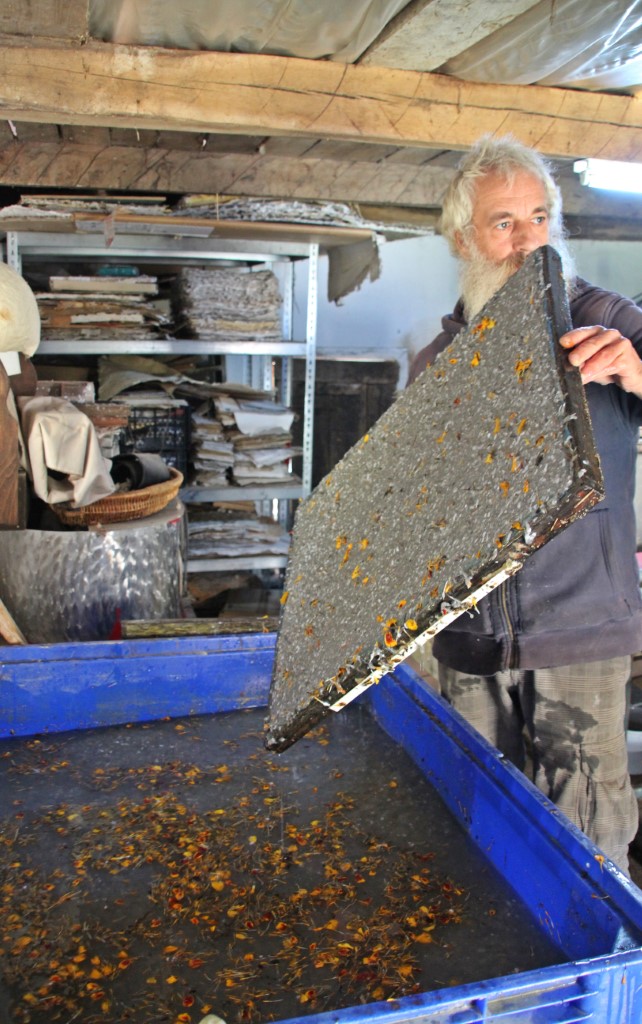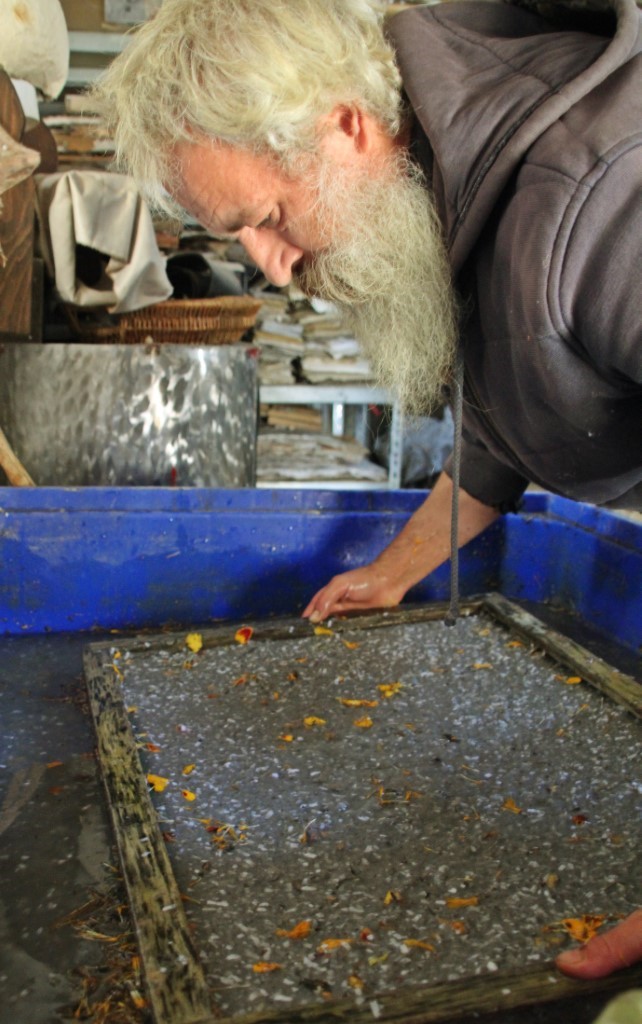 Sunt încredinţată ca va arăta şi va mirosi minunat. În atelierul său are o mulţime de lampioane grozave modelate din hârtie. În mâinile sale, aluatul de carte se poate transforma în chipuri sau siluete umane. E grozav! O artă fără pereche: „E un joc deschis care se transformă într-o hârtie bună, dacă înţelegi ce se întâmplă chimic şi mecanic în masa hârtiei. Rezultatul trebuie să aibă un pH echilibrat şi o împâslire cât mai bună a fibrelor în masă.”