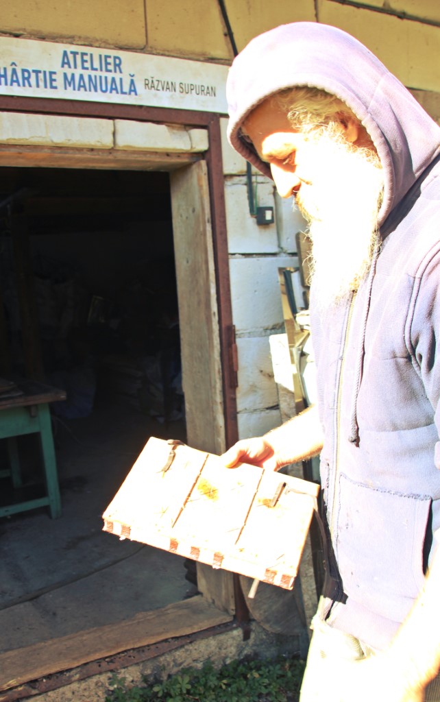 Pentru că meseria de hârtier a dispărut demult din ţară, Răzvan Supuran nu mai are unelte şi echipamente potrivite. Improvizează. De exemplu, sita nu este altceva decât o plasă fină de ţânţari, dar rezultatul este uimitor. Deasupra ei, un strat dens îşi întinde culorile, textura şi aromele. Dimensiunea sitei, dă mărimea foii. „Dacă pui o altfel de hârtie drept abajur la o lampă, ai aromaterapie gratuit”, zâmbeşte meşterul: „Avem dublu efect: vizual şi olfactiv.”