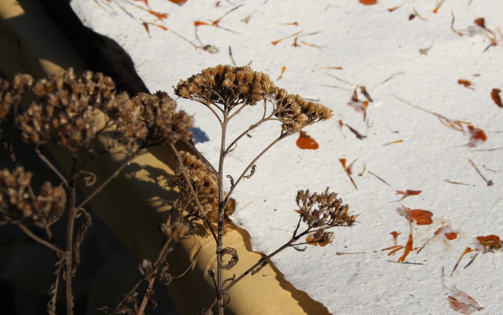 Ridică o foaie care te uimeşte: „Este hârtie plantabilă”. Aşezată contra luminii, felia de hârtie prinde viaţă – încurajate de soare, petalele din ea luminează precum mici vitralii.