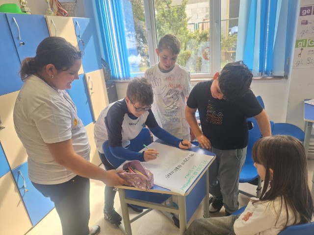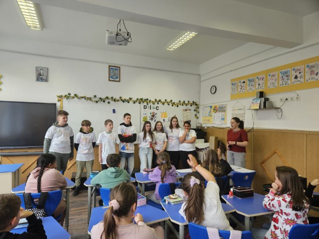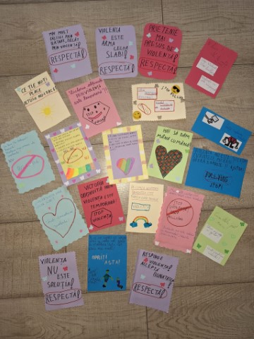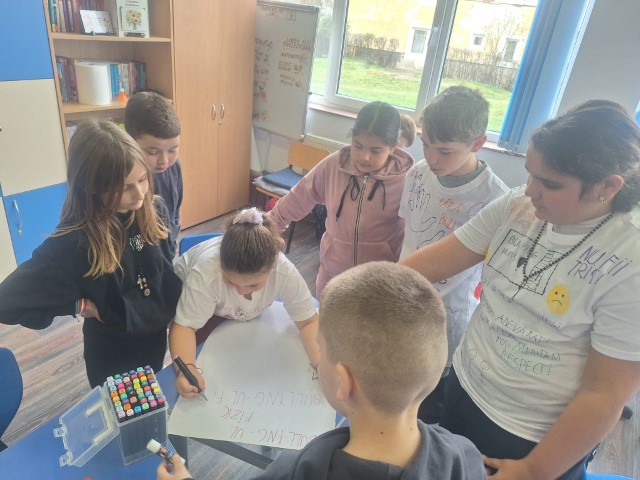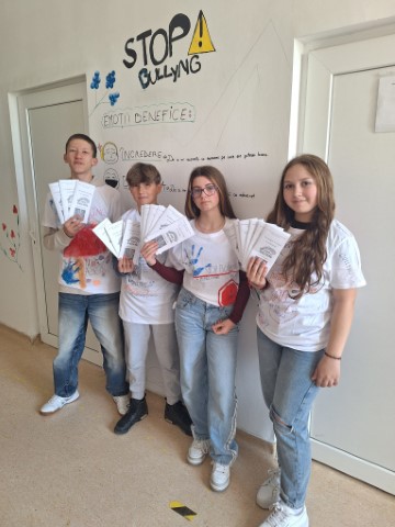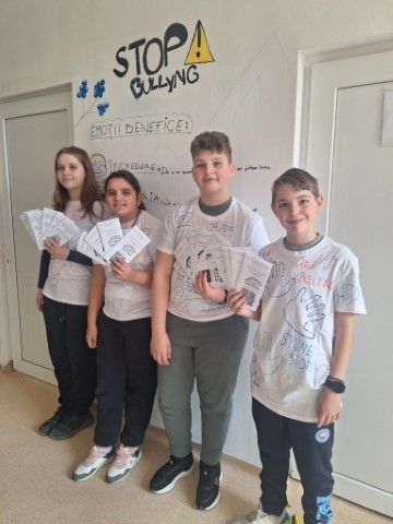 Cei mici au fost provocați să își imagineze cum arată o școală fără bullying. Materiale informative create sub formă de pliante au fost apoi distribuite elevilor din gimnaziu și liceu, dar și profesorilor din școală.