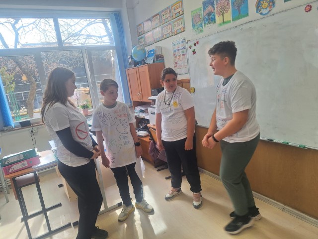 „Ambasadorii antibullying” au creat tricouri imprimate cu mesaje antiviolență și au creat scenete speciale prin care s-a exersat medierea de conflicte prin joc de rol. Au avut loc și exerciţii practice de modelare comportamentală, s-au identificat reguli de comportare în familie, în școală și în societate. S-a lucrat nu doar cu clasa, ci și pe grupe : voluntarii au făcut echipă cu elevi din a III-a C și D din clasele învățătoarelor Simona Fekete și Violeta Deminescu. S-au realizat colaje ori postere despre bullying-ul fizic, verbal și emoțional.