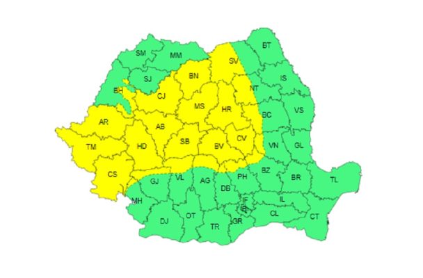 Codul galben vizează judeţele Cluj, Bistriţa-Năsăud, Harghita, Covasna, Braşov, Mureş, Sibiu, Alba, Hunedoara, Arad, Timiş, Caraş-Severin şi unele zone ale judeţelor Mehedinţi, Gorj, Vâlcea, Argeş, Dâmboviţa, Prahova, Buzău, Vrancea, Bacău, Neamţ, Suceava, Bihor.