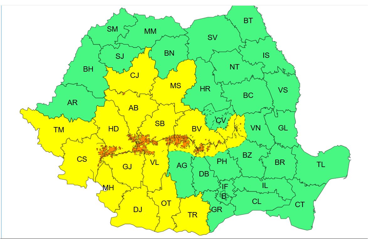 ANM: Avertizări de coduri GALBENE și PORTOCALII pentru județul Hunedoara