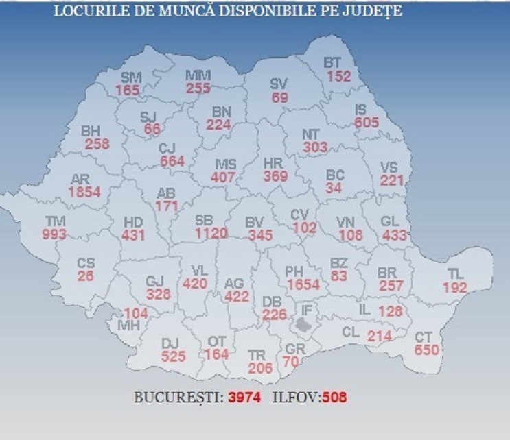 Dintre cele 19.500 de locuri de muncă disponibile la nivel naţional, 3.974 sunt în Bucureşti, 1.854 sunt în Arad, 1.654 sint în Prahova, 1.120 sunt în Sibiu, 993 sunt în Timiş, 664 sunt în Cluj, 650 sunt în Constanţa, 605 sunt în Iaşi, 525 sunt în Dolj, 508 sunt în Ilfov, 433 sunt în Galaţi, 431 sunt în Hunedoara, 422 sunt în Argeş, 420 sunt în Vâlcea, 407 sunt în Mureş, 369 sunt în Harghita, 345 sunt în Braşov, 328 sunt în Gorj, 303 sunt în Neamţ, 258 sunt în Bihor, 257 sunt în Brăila, 255 sunt în Maramureş, 226 sunt în Dâmboviţa, 224 sunt în Bistriţa-Năsăud, 221 sunt în Vaslui, 214 sunt în Călăraşi, 206 sunt în Teleorman, 192 sunt în Tulcea, 171 sunt în Alba , 165 sunt în Satu Mare, 164 sunt în Olt, 152 sunt în Botoşani, 128 sunt în Ialomiţa, 108 sun în Vrancea, 104 sunt în Mehedinţi, 102 în Covasna, 83 în Buzău, 70 în Giurgiu, 69 sunt în Suceava, 66 sunt în Sălaj, 34 în Bacău şi 26 sunt în Caraş-Severin.