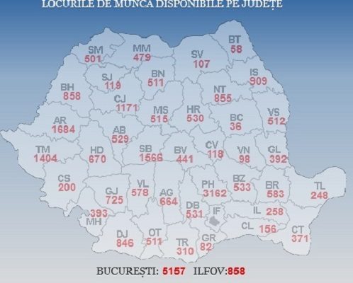 Dintre cele 30.229 de locuri de muncă disponibile la nivel naţional, 5.157 sunt Bucureşti, 3.162 sunt în Prahova, 1.684 sunt în Arad, 1.566 sunt în Sibiu, 1.404 sunt în Timiş, 1.171 sunt în Cluj, 909 sunt în Iaşi, 858 sunt în Ilfov, 858 sunt în Bihor, 855 sunt în Neamţ, 846 sunt în Dolj, 725 sunt în Gorj, 670 sunt în Hunedoara, 664 sunt în Argeş, 583 sunt în Brăila, 578 sunt în Vâlcea, 533 sunt în Buzău, 531 sunt în Dâmboviţa, 530 sunt în Harghita, 529 sunt în Alba, 515 sunt în Mureş, 512 sunt în Vaslui, 511 sunt în Olt, 511 sunt în Bistriţa-Năsăud, 501 sunt sunt în Satu Mare, 479 sunt în Maramureş, 441 sunt în Braşov, 393 sunt în Mehedinţi, 392 sunt în Galaţi, 371 sunt în Constanţa, 310 sunt în Teleorman, 258 sunt în Ialomiţa, 248 sunt în Tulcea, 200 sunt în Caraş-Severin, 156 sunt în Călăraşi, 119 sunt în Sălaj, 118 sunt în Covasna, 107 sunt în Suceava, 98 sunt în Vrancea, 82 sunt în Giurgiu, 58 sunt în Botoşani şi 36 sunt în Bacău.