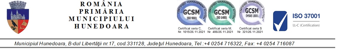 Toți cei interesați sunt invitați să urmărească evoluția proiectului și să transmită eventuale observații sau propuneri privind intenția de elaborare a PUZ în perioada 22.07.2024-08.08.2024, pe adresa Primăriei municipiului Hunedoara, Bulevardul Libertății nr. 17, e-mail: info@primariahunedoara.ro , telefon: 0254/716 322 int 231, fax: 0254/716 087.
