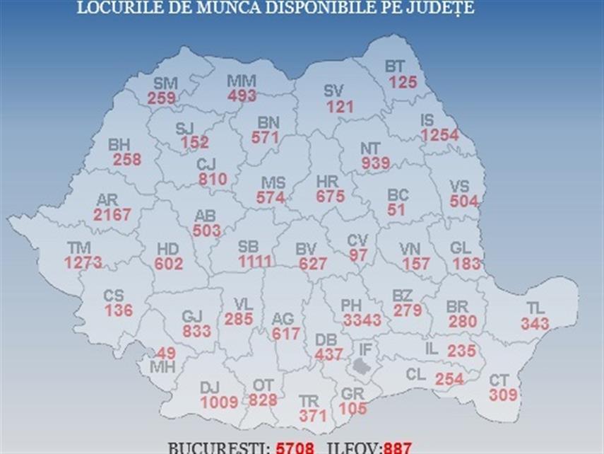 Cele mai multe locuri de muncă sunt disponibile în Bucureşti – 5.708, în timp ce în Prahova sunt 3.343 de locuri de muncă vacante, în Arad – 2.167, în Timiş – 1.273, în Iaşi – 1.254, în Sibiu – 1.111 şi în Dolj – 1.009.