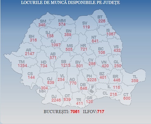 Alte 359 de locuri de muncă sunt disponibile în Tulcea, 340 în Satu Mare, 316 în Bihor, 304 în Mehedinţi, în timp ce în Covasna sunt 286 de locuri de muncă vacante, în Vâlcea – 254, în Galaţi – 250, în Botoşani – 226, în Călăraşi – 216, în Sălaj – 158, în Caraş-Severin – 144, în Giurgiu – 120, în Suceava – 119, în Ialomiţa – 118 şi în Bacău – 106.