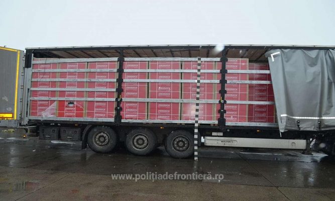 „În urma activităţii de inventariere a ţigărilor s-a constatat că în cele două autovehicule era ascunsă, în plăcile de rigips şi vată minerală, cantitatea totală de 941.027 de pachete cu ţigări (476.117 pachete în primul autocamion şi 464.910 pachete în cel de-al doilea), diferite mărci. Întreaga cantitate de ţigări a fost ridicată în vederea confiscării, iar cele două autovehicule au fost indisponibilizate””, se arată într-un comunicat transmis, joi, de Poliţia de Frontieră.