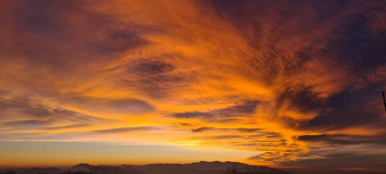 Cabanierii din Parâng au surprins, aseară, imagini spectaculoase cu apusul din stațiunea montană Parâng. Cerul s-a înroșit la lăsarea serii, iar norii parcă pluteau. A fost un fenomen spectaculos în care ultimele raze ale soarelui au străpuns depărtările și au pictat cerul în culori aprinse.