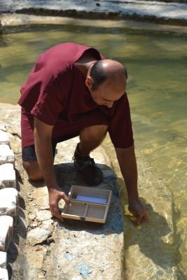 În timp ce aroma învăluie publicul, reenactorul povesteşte zecilor de oameni care urmăresc momentul: „Vom reconstitui un ritual care, credem noi, că se făcea la Germisara, la terme. La un moment dat, când s-au făcut cercetări în bazinul antic, arheologii au găsit nişte tăbliţe de aur.