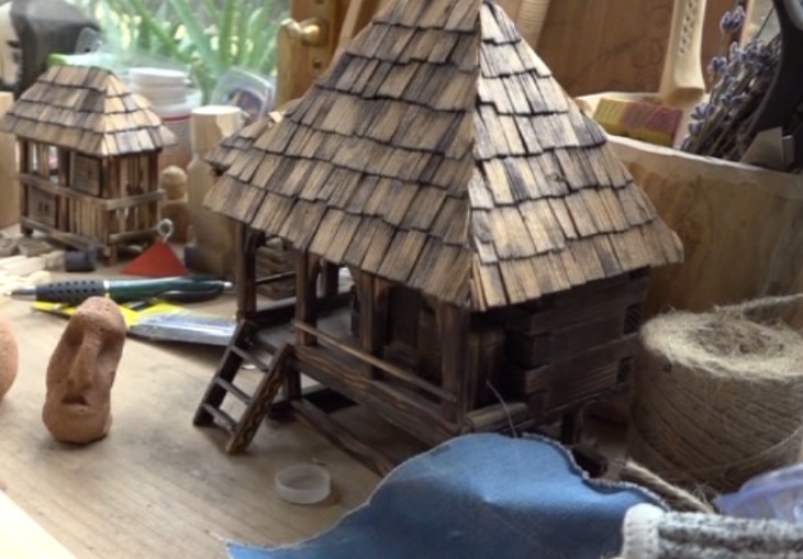 „Lemnul se însemnează cu creion, se decupează cu mare atenţie, apoi se îmbină. De cele mai multe ori, folosesc lemn reciclat sau recuperat din paleţi. Majoritatea căsuţelor pe care le fac sunt expuse în Muzeul Astra din Sibiu sau la Muzeul Ţăranului Român din Bucureşti”, povesteşte tânărul, în timp ce trasează conturul cu creionul. Gospodăriile lui ţărăneşti sunt realizate în detaliu, la scara de 1:40, şi sunt reproduceri fidele ale exteriorului, dar şi a interiorului caselor, anexelor, ale obiectelor din curtea bunicilor.