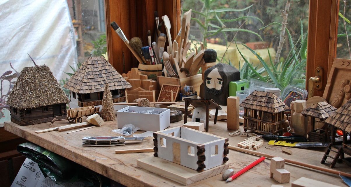 Ca să ajungă la asemenea piese în miniatură, Radu lucrează ore în şir cu tot felul de unelte, dar pentru unele piese foloseşte un traforaj electric. Are o adevărată pasiune pentru prelucrarea lemnului. Recunoaşte că, la început, avea degetele pline de tăieturi. Au trecut ani şi, odată cu experienţa, a căpătat şi siguranţă în mişcări: aşează piesa pe suportul traforajului, ciupeşte lama de metal şi o ascultă cum vibrează. Doar apoi începe să taie: „Lucrez cât mai încet, ca să se decupeze cât mai exact, altfel am probleme la îmbinare. Trebuie să fiu atent la ce scot şi ce las, ca să îmi iese zidul căsuţei cum trebuie. După îmbinare, e bine să rămână un pic din capete de lemn ale pereţilor afară, exact ca la cele ţărăneşti. Mi-a luat ceva timp până mi-am dat seama cum trebuie făcute căsuţele. Ăsta e visul meu – să pot face gospodării ale ţăranului hunedorean şi vreau să găsesc tot mai multe modele.”