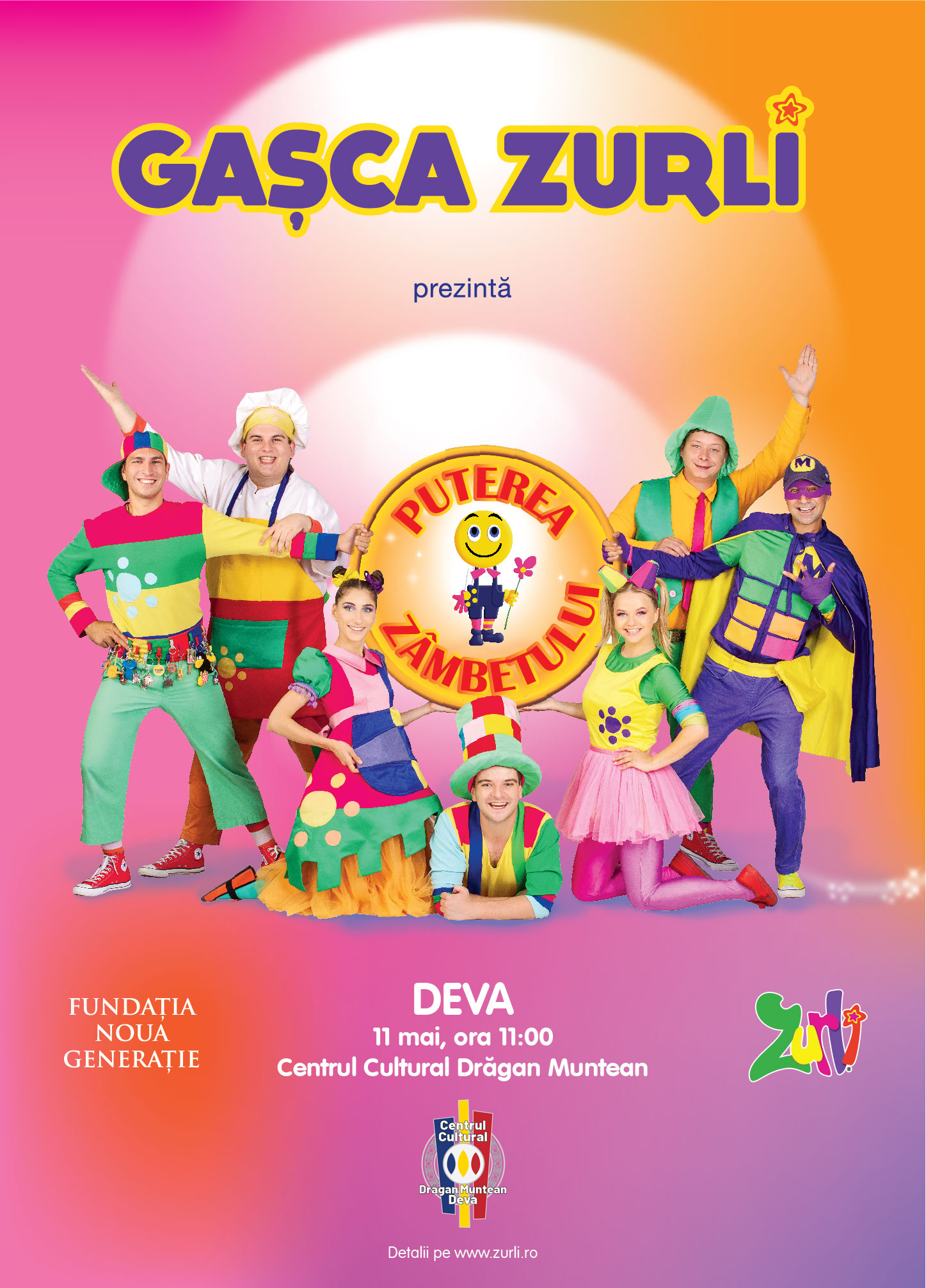 Gașca Zurli continuă campania prin care își propune să pună zâmbetul tuturor copiilor pe harta României. Puterea Zâmbetului Zurli ajunge la Deva, în sala mare a Centrului Cultural ”Drăgan Muntean”, sâmbătă, 11 mai 2019, la ora 11:00.