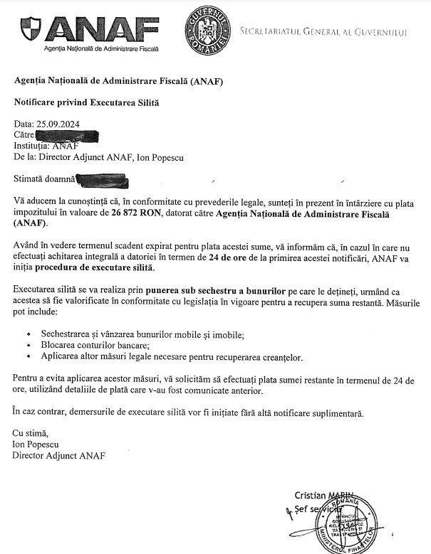 O nouă campanie de emailuri false, transmise în numele ANAF, este în desfășurare în această perioadă. Contribuabililor, persoane fizice, le este transmisă o „Nota informativă” prin care sunt înștiințati cu privire la o presupusă datorie, pentru care este necesară plata pentru evitarea executării silite și a valorificării bunurilor.