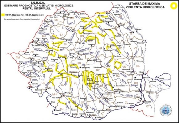 Astfel, potrivit INHGA, între orele 12:00 şi 24:00 atenţionarea este valabilă pentru râurile din bazinele hidrografice: Vişeu – bazin superior şi afluenţi bazin mijlociu şi inferior, Iza – bazin superior şi afluenţi bazin mijlociu şi inferior (judeţul Maramureş), Someşul Mare – bazin superior şi afluenţi bazin mijlociu şi inferior (judeţul Bistriţa Năsăud), Someşul Mic – bazin superior şi afluenţi bazin mijlociu şi inferior (judeţele: Bihor şi Cluj), Crişul Repede – bazin superior şi afluenţi bazin mijlociu şi inferior (judeţele: Cluj şi Bihor), Crişul Negru – bazin amonte S.H. Beiuş (judeţul Bihor), Crişul Alb – bazin amonte S.H. Gurahonţ (judeţele: Hunedoara şi Arad), Mureş – bazin amonte S.H. Glodeni (judeţele: Harghita şi Mureş), Arieş – bazin superior şi afluenţi bazin mijlociu şi inferior (judeţele: Alba şi Cluj), Mureş – afluenţii aferenţi sectorului aval confluenţă cu râul Târnava – amonte S.H. Săvârşin (judeţele: Alba, Sibiu, Hunedoara şi Arad), Bega – bazin amonte S.H. Făget şi afluenţii aferenţi sectorului aval S.H. Făget – amonte S.H. Balinţ (judeţele: Timiş şi Arad), Timiş – afluenţii aferenţi sectorului aval S.H. Teregova – amonte S.H. Lugoj (judeţele: Caraş Severin şi Timiş), Cerna – bazin superior şi afluenţi bazin mijlociu şi inferior (judeţele: Gorj şi Caraş Severin), Desnăţui – bazin superior şi afluenţi bazin mijlociu şi inferior (judeţele: Mehedinţi şi Dolj), Jiu – bazin amonte S.H. Sadu şi afluenţii aferenţi sectorului aval S.H. Sadu – amonte S.H. Rovinari, Gilort – bazin superior şi afluenţi bazin mijlociu şi inferior, Motru – bazin superior şi afluenţi bazin mijlociu şi inferior (judeţele: Hunedoara, Gorj, Mehedinţi şi Dolj), Râul Negru – bazin superior şi afluenţi bazin mijlociu şi inferior (judeţele: Covasna şi Braşov), Olt – afluenţii aferenţi sectorului aval S.H. Sebeş Olt (judeţele: Sibiu, Vâlcea, Argeş, Gorj, Olt şi Dolj), Argeş – bazin superior, Dâmboviţa – bazin superior (judeţele: Argeş şi Dâmboviţa), Ialomiţa – bazin amonte S.H. Moroeni şi afluenţii aferenţi sectorului aval S.H. Moroeni – amonte S.H. Siliştea Snagovului (judeţele: Dâmboviţa, Prahova şi Ilfov), Prahova – bazin superior şi afluenţi bazin mijlociu şi inferior (judeţele: Prahova şi Buzău), Buzău – bazin amonte Ac. Siriu şi afluenţii aferenţi sectorului aval Ac. Siriu – amonte S.H. Baniţa (judeţele: Braşov, Covasna, Buzău şi Prahova), Suceava – bazin superior şi afluenţi bazin mijlociu şi inferior (judeţul Suceava), Moldova – bazin superior şi afluenţi bazin mijlociu şi inferior (judeţele: Suceava şi Neamţ), Bistriţa – bazin superior şi afluenţi bazin mijlociu şi inferior (judeţele: Suceava, Neamţ, Harghita şi Bacău), Trotuş – bazin amonte S.H. Ghimeş Făget şi afluenţii aferenţi sectorului aval S.H. Ghimeş Făget – amonte S.H. Vrânceni (judeţele: Harghita, Neamţ, Bacău şi Covasna), Putna – bazin superior şi afluenţi bazin mijlociu şi inferior (judeţul Vrancea).