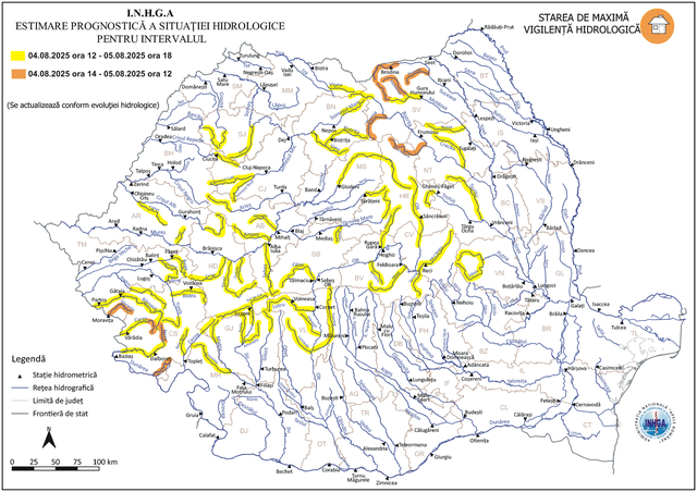 Institutul Național de Hidrologie și Gospodărire a Apelor (INHGA) a emis o atenționare hidrologică valabilă pentru mai multe județe din țară, inclusiv pentru Hunedoara, începând de luni, 4 august, ora 12:00, până marți, 5 august, ora 18:00, din cauza riscului de scurgeri importante pe versanți, torenți și viituri rapide pe râurile mici.