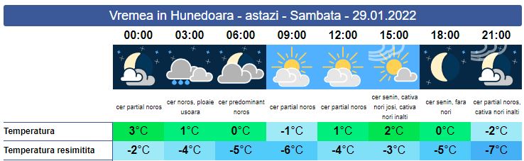 Sâmbătă, vor cădea precipitații sub formă de ninsoare doar la munte. Soarele răsăre la ora 7:52. La noapte se vor înregistra ploi ce vor favoriza formarea poleiului. Peste zi, cerul va fi împărțit de soare și nori, iar spre sfârșitul intervalului se va însenina. La munte va ninge, iar vântul va sufla tare, spulberând zăpada. În restul teritoriului vântul va sufla slab și moderat cu intensificări temporare. Soarele apune la ora 17:30. Valorile termice se vor încadra între -1 și 2 grade.