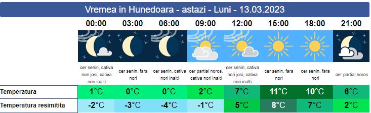 Luni, cerul va fi mai mult senin. Soarele răsare la ora 06:44. La noapte și în prima partea zilei temperaturile vor fi modeste, ceață în zonele joase, dar treptat, odată cu dispersarea norilor, temperaturile vor deveni mai prietenoase. Vântul va sufla slab spre moderat cu intensificări în zonele montane, unde temperaturile se vor menține negative. Soarele va apune la ora 18:31. Minimele se vor încadra între 0 și 2 grade, iar maxima zilei va urca spre 11 grade.
