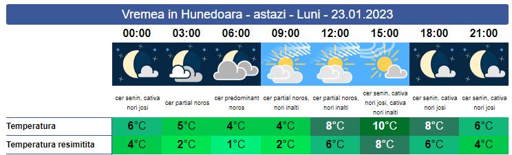 Luni, temperaturile se mențin calde, în zona noastră. Soarele răsare la ora 7:58. Cerul va fi variabil spre senin, în a doua parte a zilei, iar la munte va ninge în această noapte și în primele ore ale dimineții. Vântul va sufla slab spre moderat cu unele intensificări în zonele înalte. Soarele va apune la ora 17: 22. Valorile termice se vor situa între 4 și 10 grade, iar la munte acestea vor fi negative.