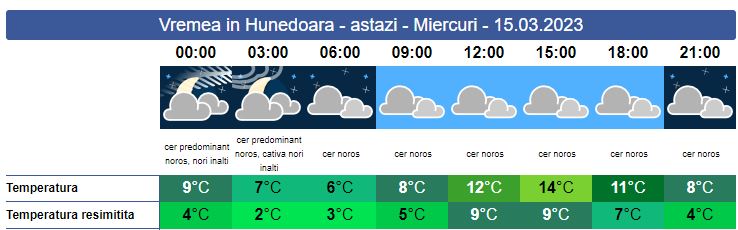 Miercuri, temperaturile sunt în scădere. Soarele răsare la ora 06:40. Cerul se va înnora treptat, iar la sfârșitul zile se prognozează posibile precipitații. La munte, cerul va fi variabil, vântul va sufla moderat spre tare, iar maxima va urca spre zero grade. Soarele va apune la ora 18:34. Minima zilei se va încadra în jurul valorii de 6 grade, iar maxima va urca spre 14 grade.