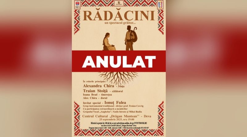 Read MoreDin motive independente de voința noastră, spectacolul „Rădăcini”, programat pentru 25 septembrie 2025, ora 19:00, a fost anulat. Rambursarea biletelor: