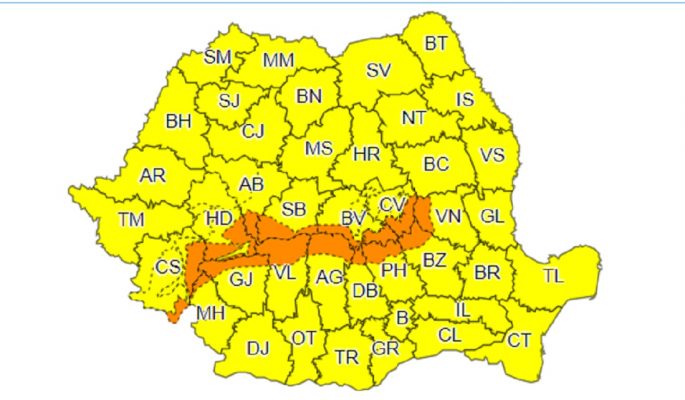 Aceştia anunţă, de asemenea, cod portocaliu de vânt în zonele montane înalte.